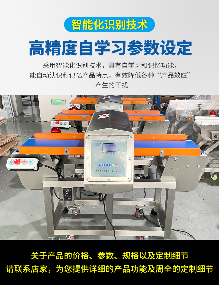 安護神EJH-360金屬檢測機采用先進的雙信號(磁感+電導(dǎo))或多頻技術(shù),精準(zhǔn)檢測鐵、非鐵(如銅、鋁、不銹鋼)等各類金屬異物,靈敏度可達Fe 0.3mm, SUS 0.5mm (具體數(shù)值根據(jù)產(chǎn)品實際性能填寫),有效杜絕漏檢。獨特算法和屏蔽設(shè)計,有效抵抗產(chǎn)品效應(yīng)(濕、鹽、酸等)和環(huán)境干擾(振動、溫度波動),大幅降低誤報率,保障生產(chǎn)流暢性。配備氣動翻板、推桿、吹氣等多種快速響應(yīng)剔除機構(gòu),確保檢測到的含金屬產(chǎn)品被有效隔離,不影響合格品通過。 適用于肉禽水產(chǎn)加工、烘焙與糖果、乳制品、休閑零食、調(diào)味品與醬料、速凍食品、寵物食品、包裝材料進料檢測等行業(yè)