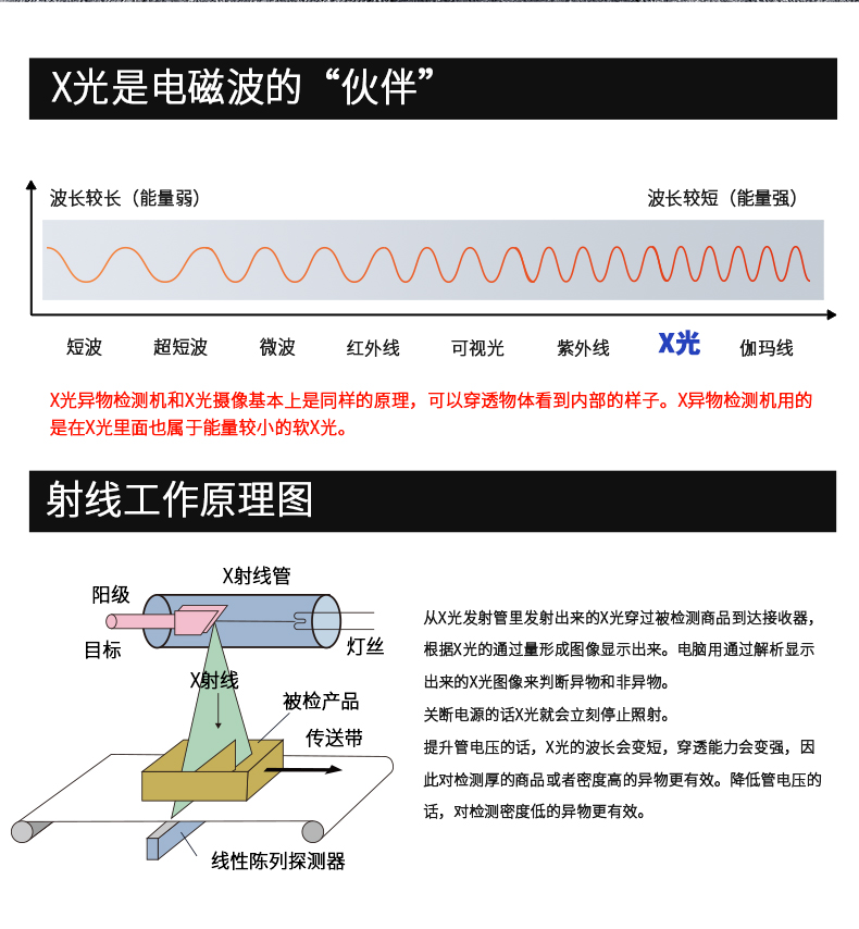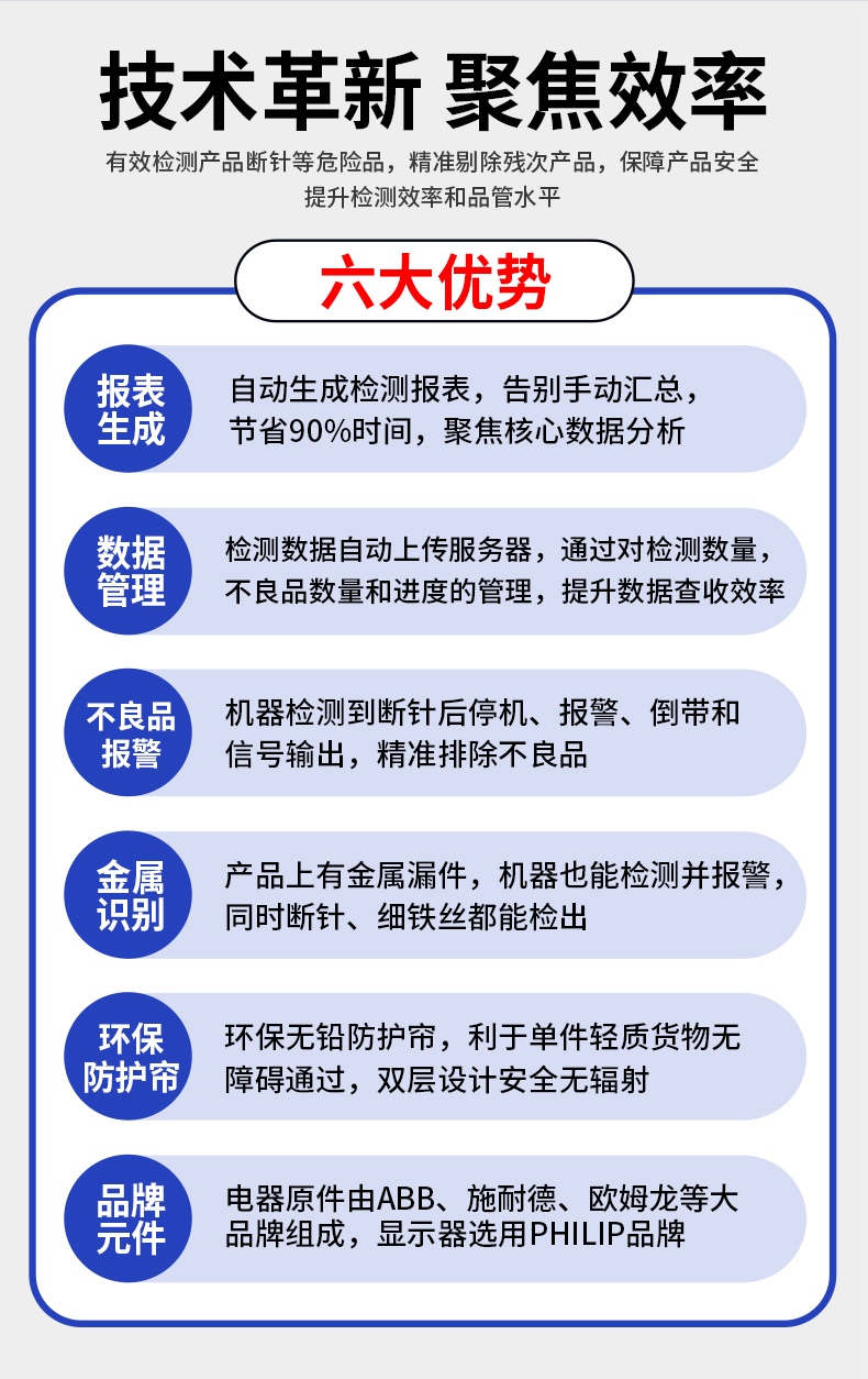 采用先進的AI智能算法頻技術,精準檢測斷針等金屬異物,靈敏度可達Fe 0.2mm,雙屏黑白高清成像,支持數(shù)據(jù)自動上傳服務器,檢測報表自動生成