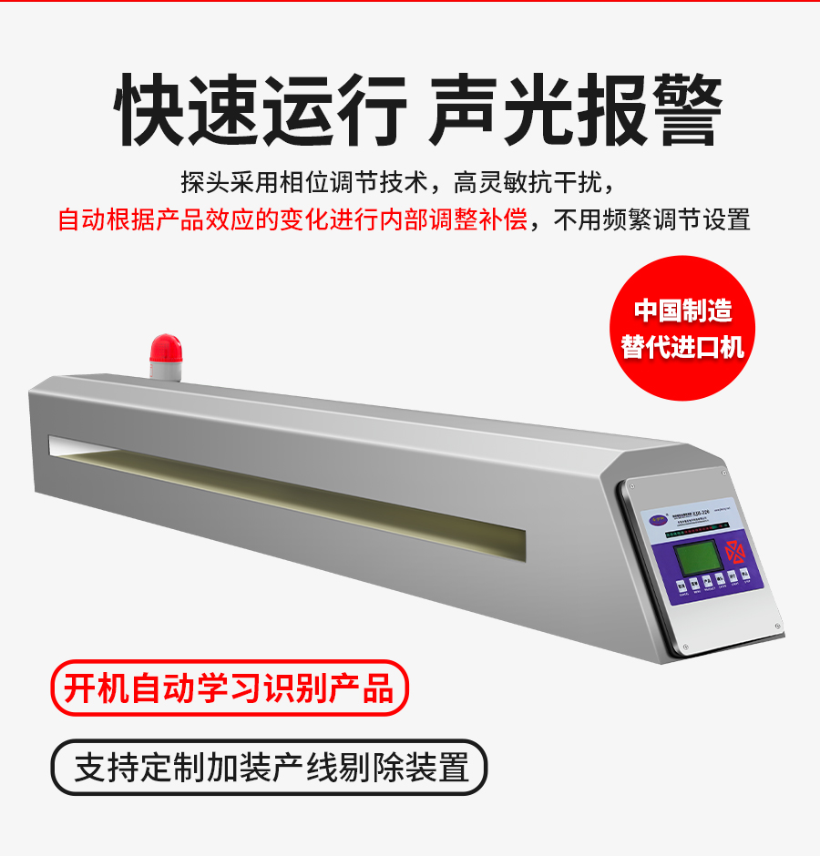 安護(hù)神EJH-320金檢機——專為大體積產(chǎn)品定制,有效解決金屬檢測瓶頸!采用多頻段智能識別技術(shù),即使是大體積產(chǎn)品,也能精準(zhǔn)捕捉鐵、非鐵、不銹鋼等微小金屬雜質(zhì)??垢蓴_能力強,避免產(chǎn)品效應(yīng)(如潮濕、含鹽)導(dǎo)致的誤報。高效流水線集成,自動報警+剔除一體化,無縫對接包裝線/物流分揀線。